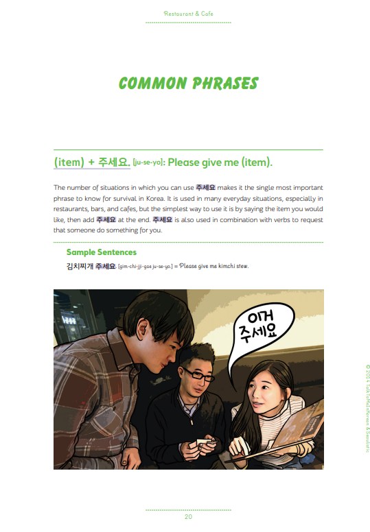We picked most essential Korean phrases you need to know while traveling or living in Korea, and divided them into 20 different situations, which comes with detailed explanations about the phrase itself AND fun and useful information about the situation where the phrases are used in. Also, the tips here and there in the book we provide as the locals will help you better understand what is going on, what to do, and what not to do, whichever situation you are in.
